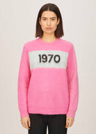 1970 gets the mohair treatment. Oversized, knitted in fine italian super kid mohair with 1970 intarsia. Ribbed hem, neck and cuffs. Model is a size 8 wearing a size small, height 5"10.5. We recommend taking a size down for a more fitted style, or your regular size for an oversized fit.
