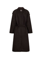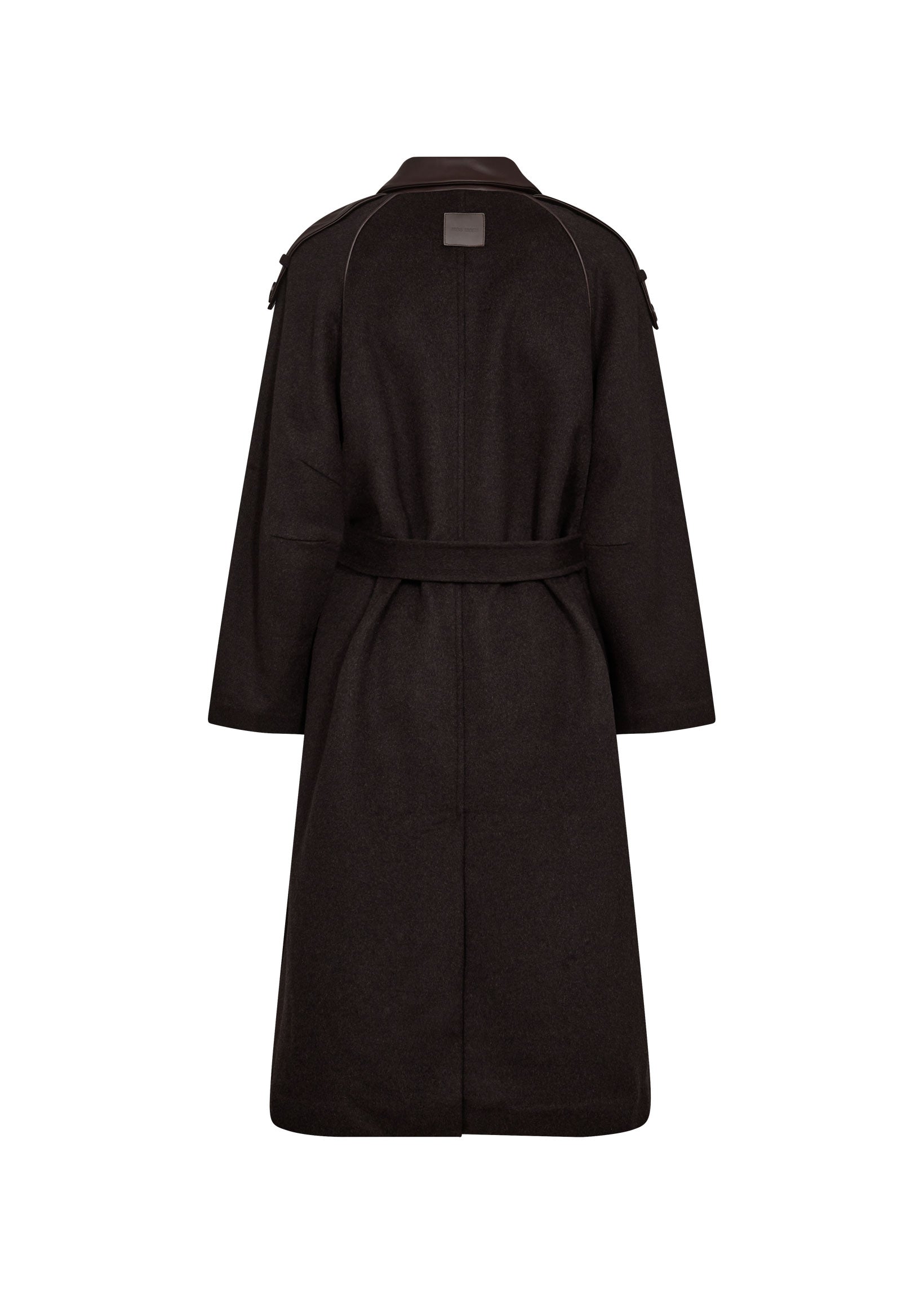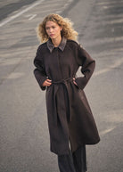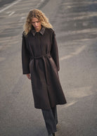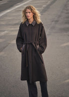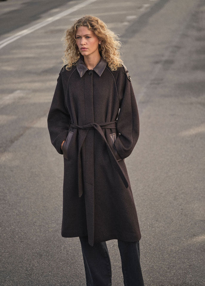 This sophisticated wool coat is a perfect blend of elegance and functionality, designed with a classic collar, long sleeves, and a concealed button closure for a streamlined look. Thoughtfully placed leather details at the collar, pockets, and shoulder straps add a refined touch, while the matching belt cinches the waist for a flattering fit. Its longline silhouette and regular fit make it a timeless outerwear staple, offering both warmth and effortless style.