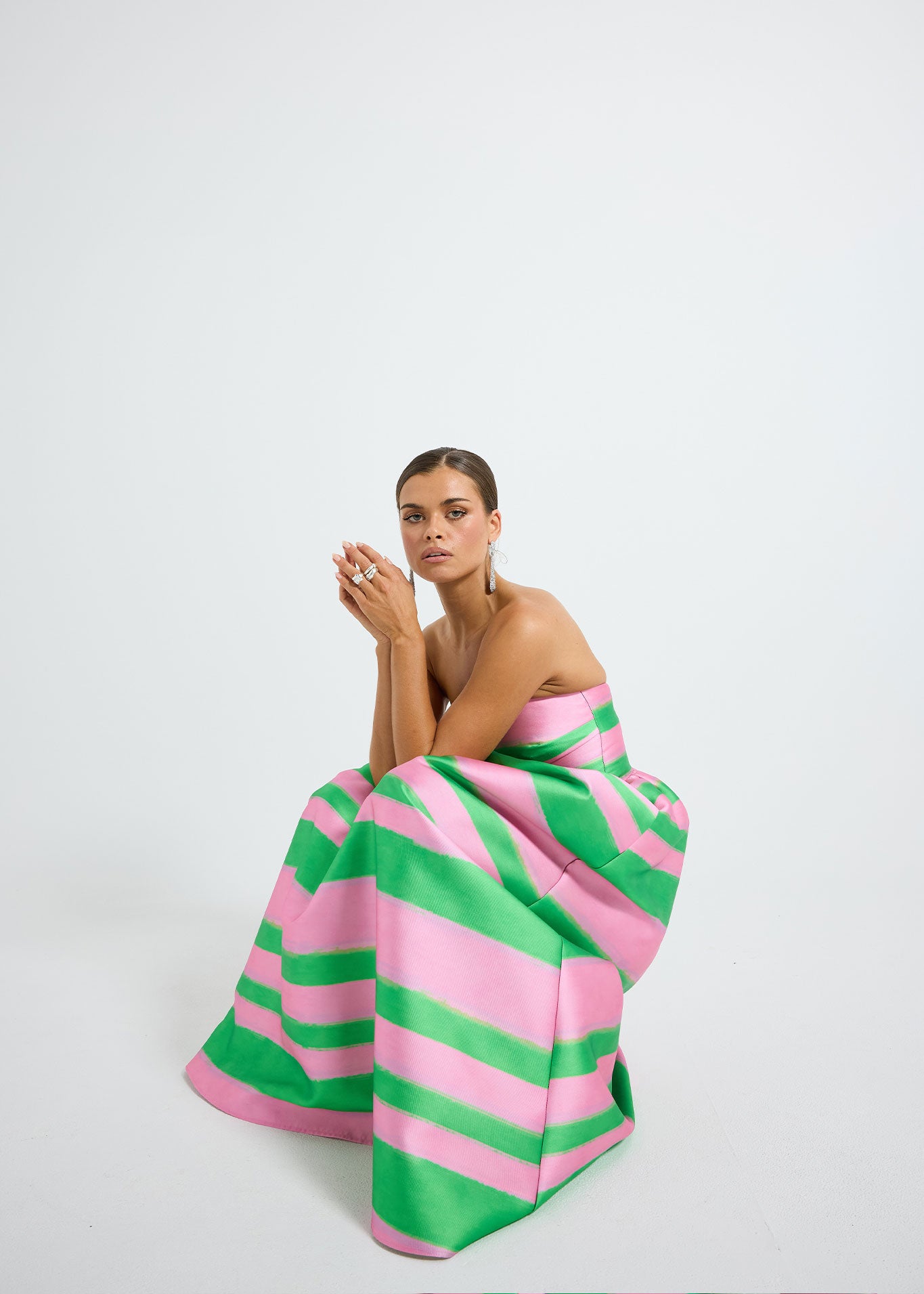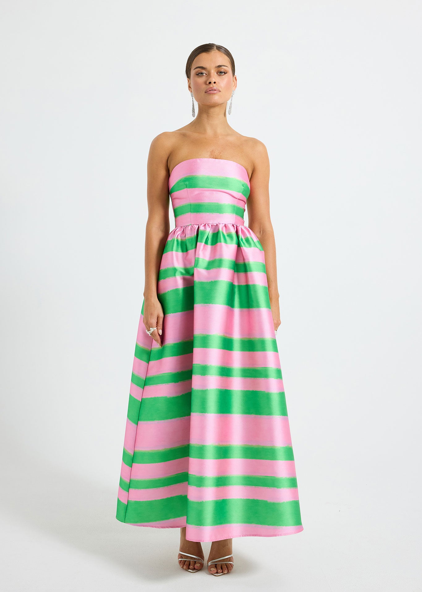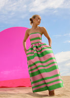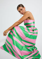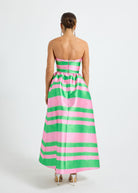 The Gigi Strapless Midi by PASDUCHAS is crafted from a lustrous-finish taffeta, featuring an exclusive green and pink stripe print. It showcases a strapless neckline with boning, cinched at the waist before flaring into a full midi-length skirt complete with pockets. The piece is secured with a centre-back concealed zip fastening for comfort and ease of fit.