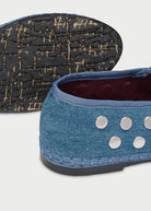 - Denim ballerina v-hole in blue with blue piping and silver studs.