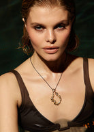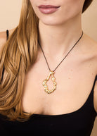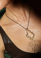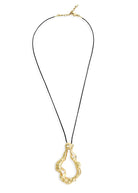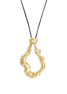 The Rena necklace features a thin black leather cord with an 18K gold-plated pendant with an irregular shape and organic textured finish - accented with sparkling cubic zirconia stones.
