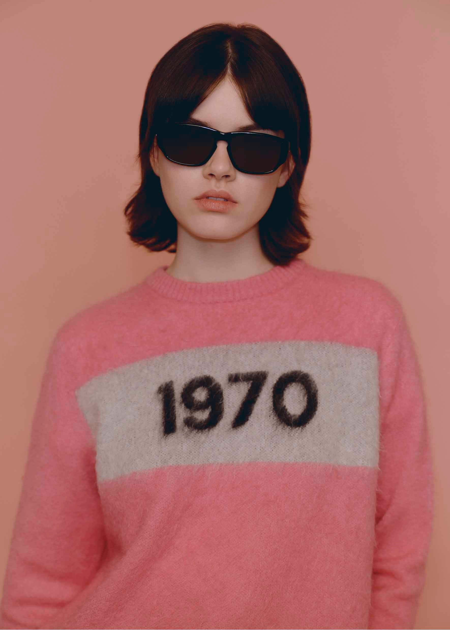 1970 gets the mohair treatment. Oversized, knitted in fine italian super kid mohair with 1970 intarsia. Ribbed hem, neck and cuffs. Model is a size 8 wearing a size small, height 5"10.5. We recommend taking a size down for a more fitted style, or your regular size for an oversized fit.
