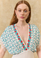 - V-neck wrap-around with lace overlay along the neckline and floral embroidery.