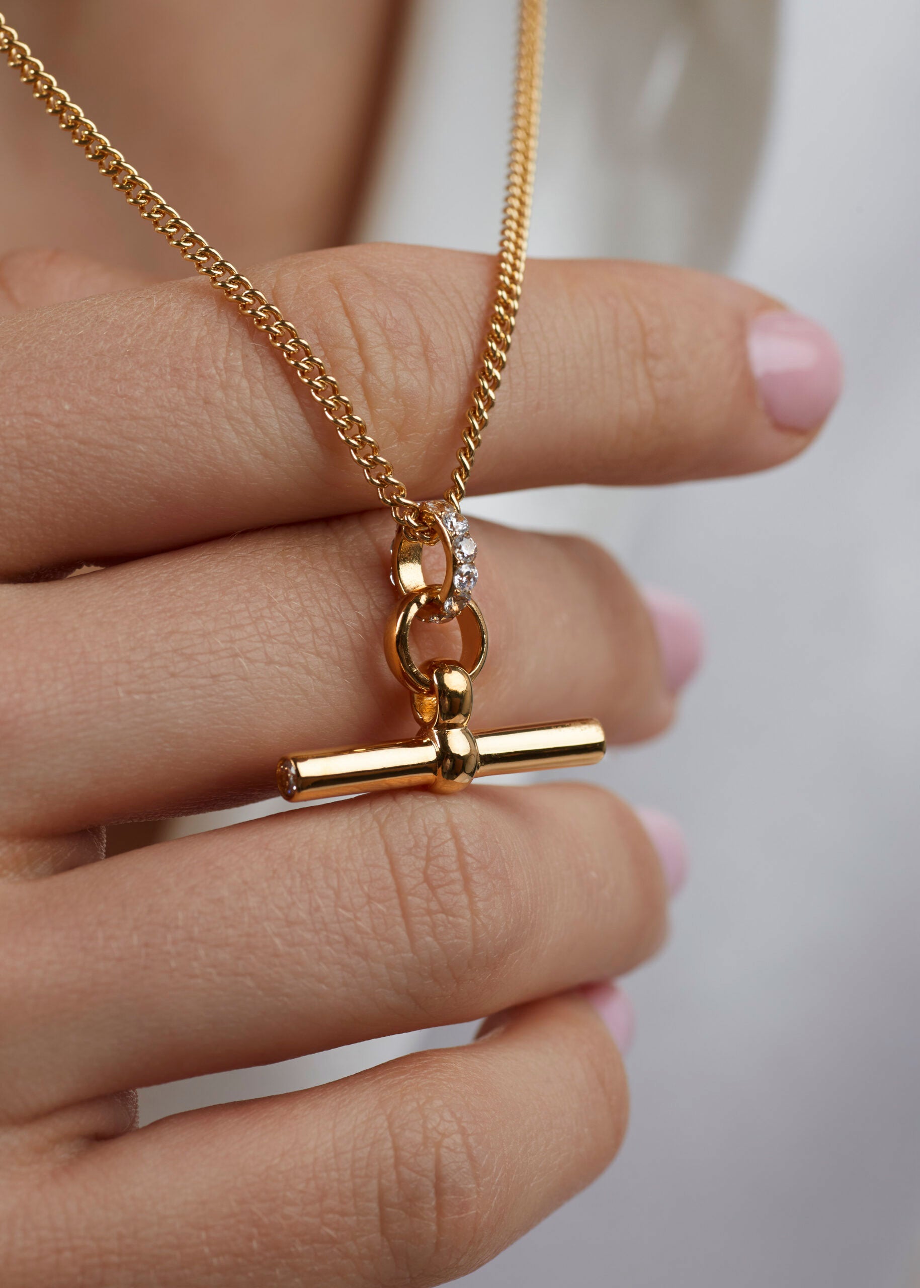 Small Jewelled Gold T-Bar On Fine Curb Chain