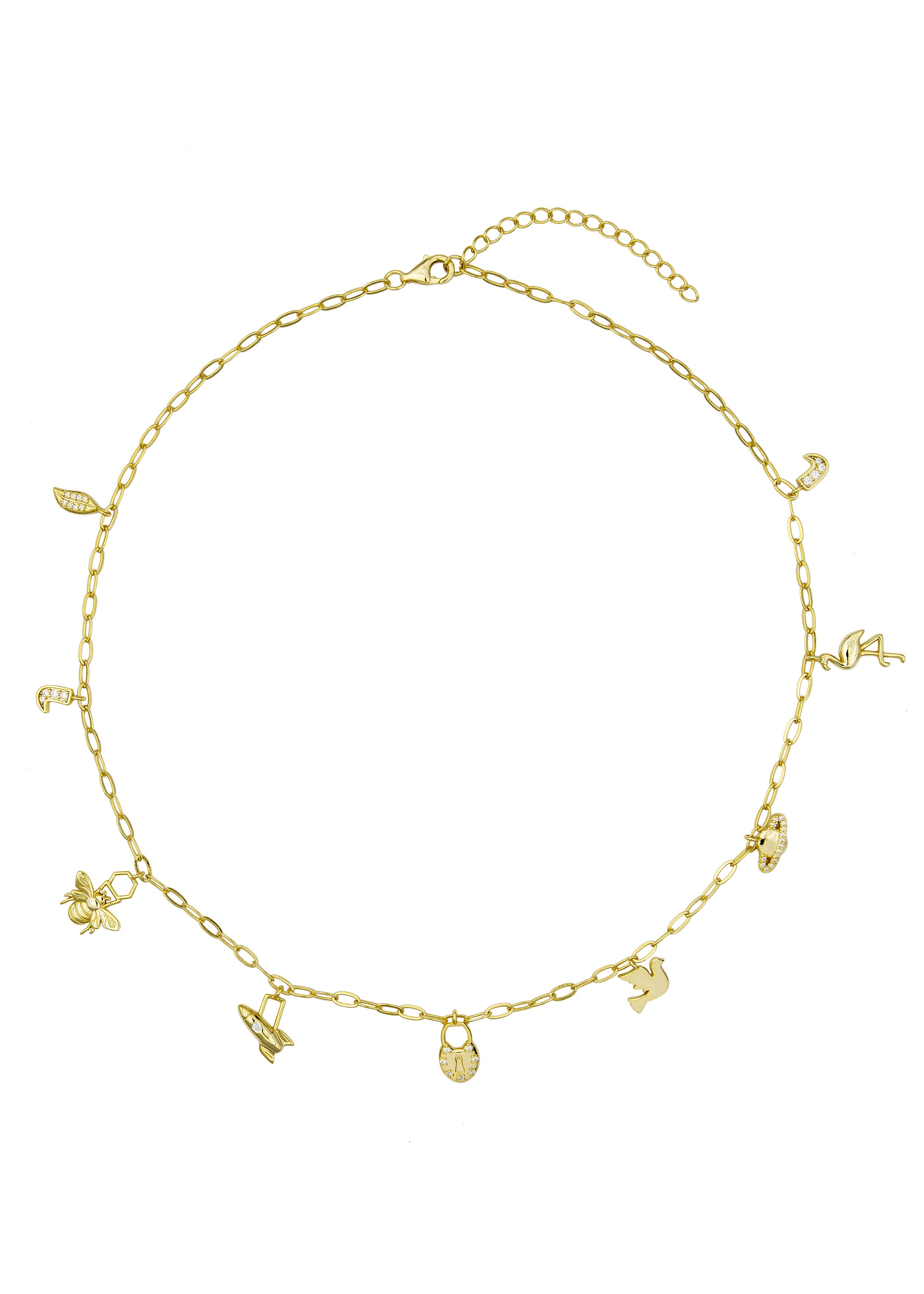e redesign our charm necklace every season and I think this is our best yet.  On a loose larger link the charms are abundant and fun here, a little bee, a rocket ship, leaves, a planet and lots more - some are adored with zirconia stones and some are plain gold.