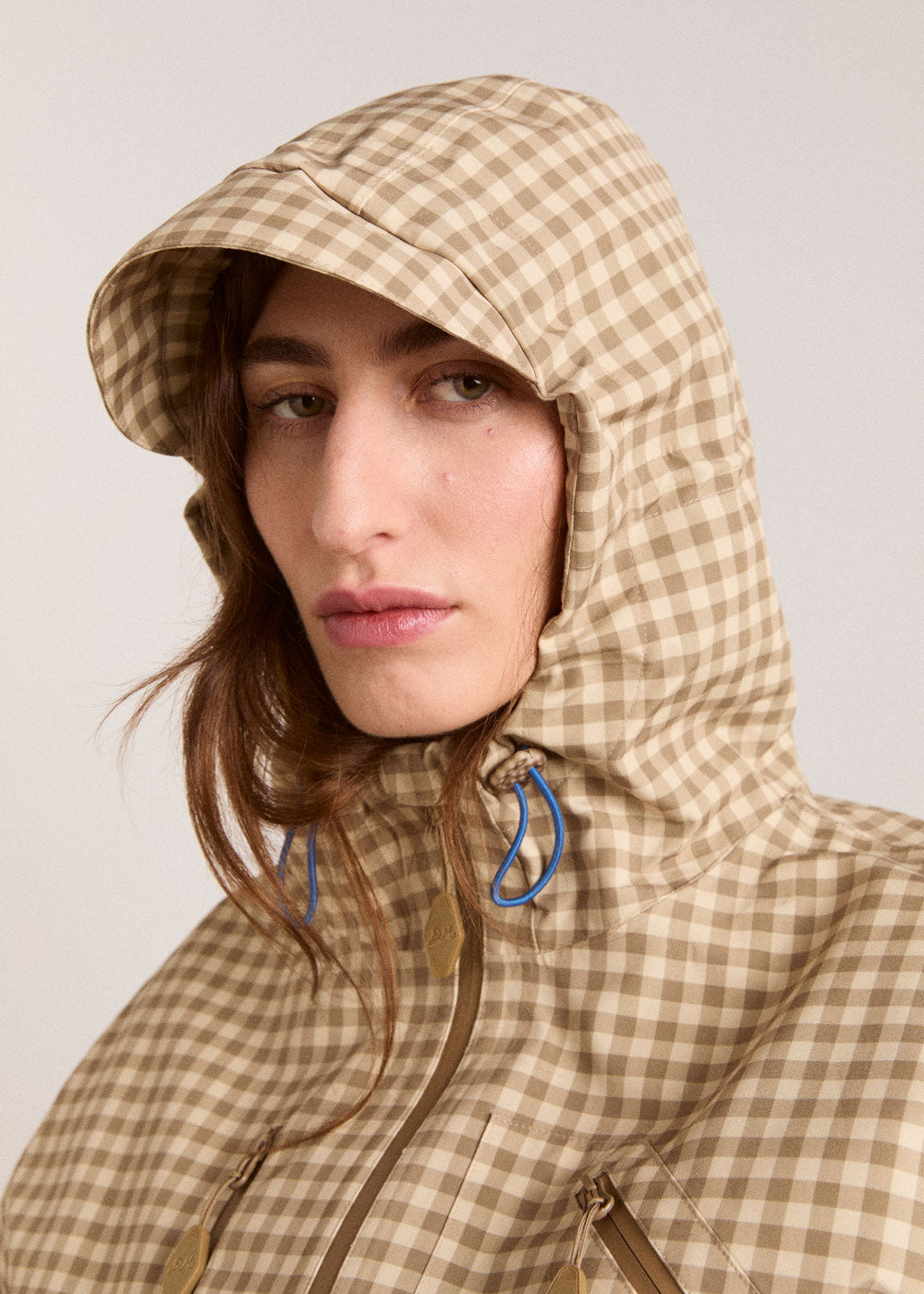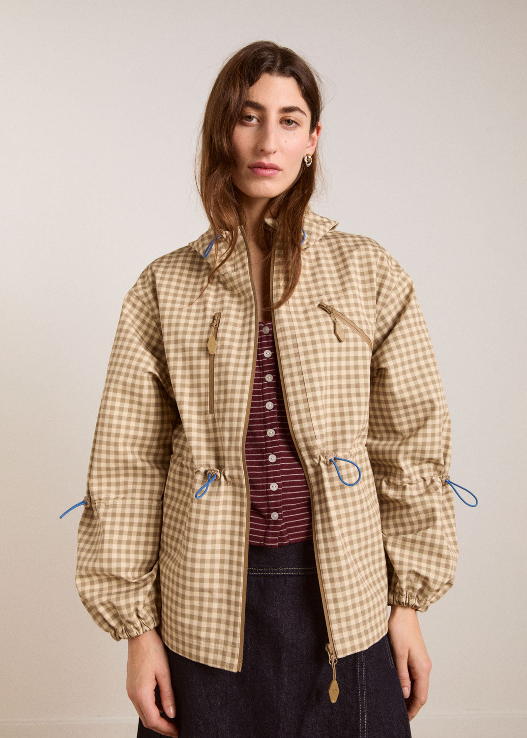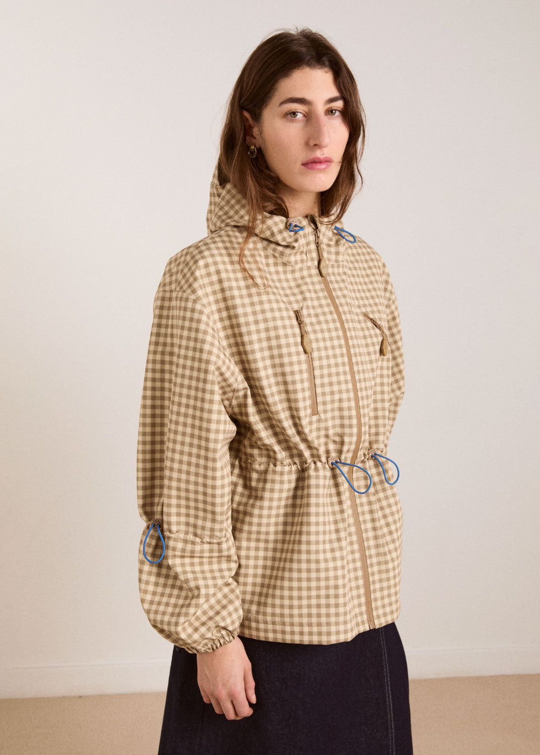 • Adjustable waist and sleeve in contrast blue bungee cord detail