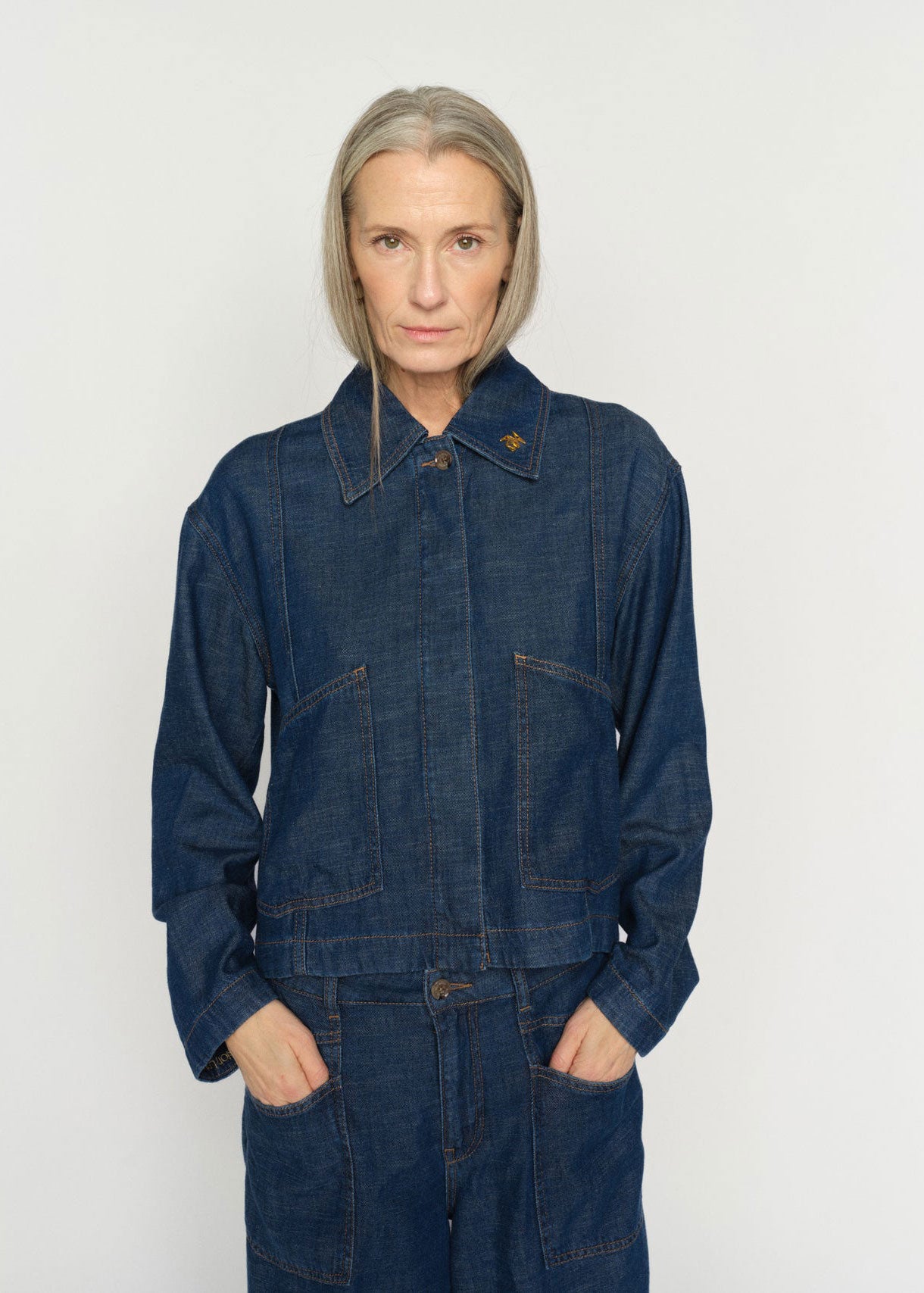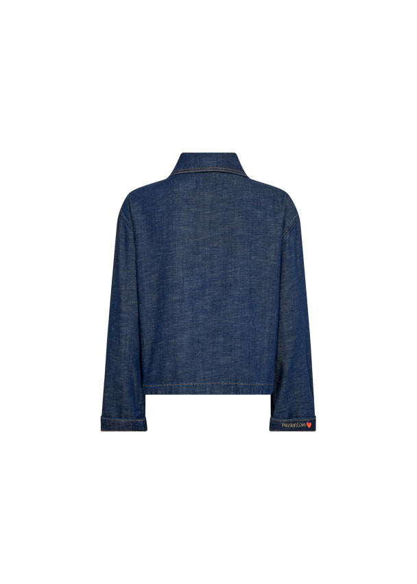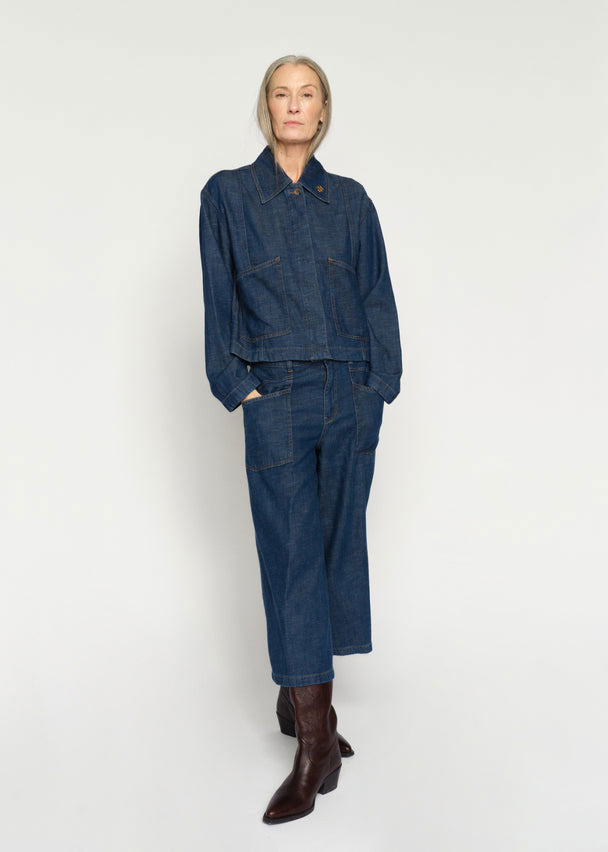 This denim-inspired jacket offers a refined take on casual dressing. Designed in a relaxed fit with a classic collar and button closure, it features clean lines and subtle stitching for a modern finish. Perfect for layering over dresses, knits, or tailored pants for effortless versatility.