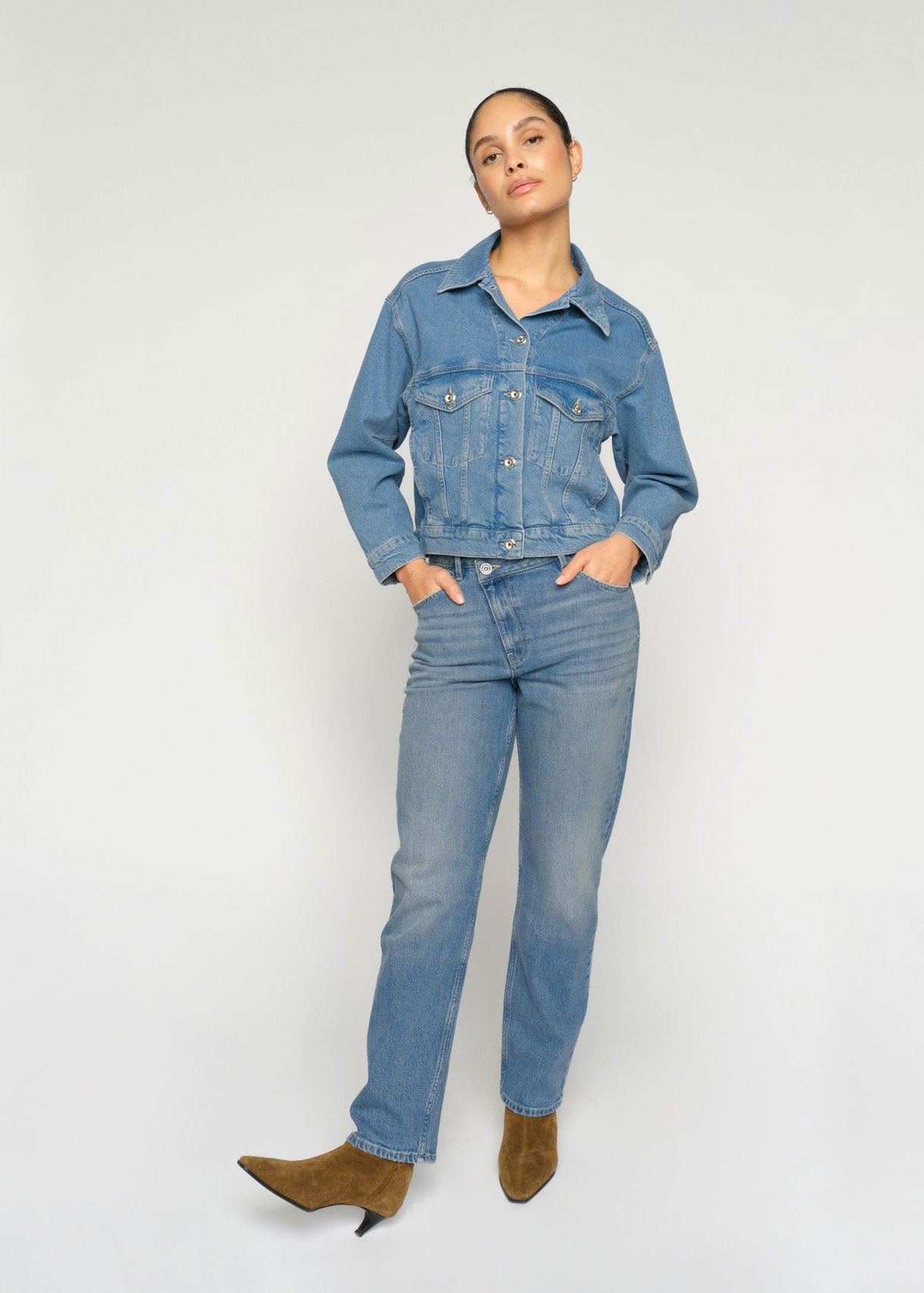 A relaxed yet refined denim essential, these boyfriend-fit jeans feature a slanted front pocket detail and a soft mid-rise waist for all-day comfort. Crafted from organic cotton with a touch of stretch, they offer a casual, lived-in look with turned-up hems - perfect for pairing with tees, blouses, or knits for effortless styling.
