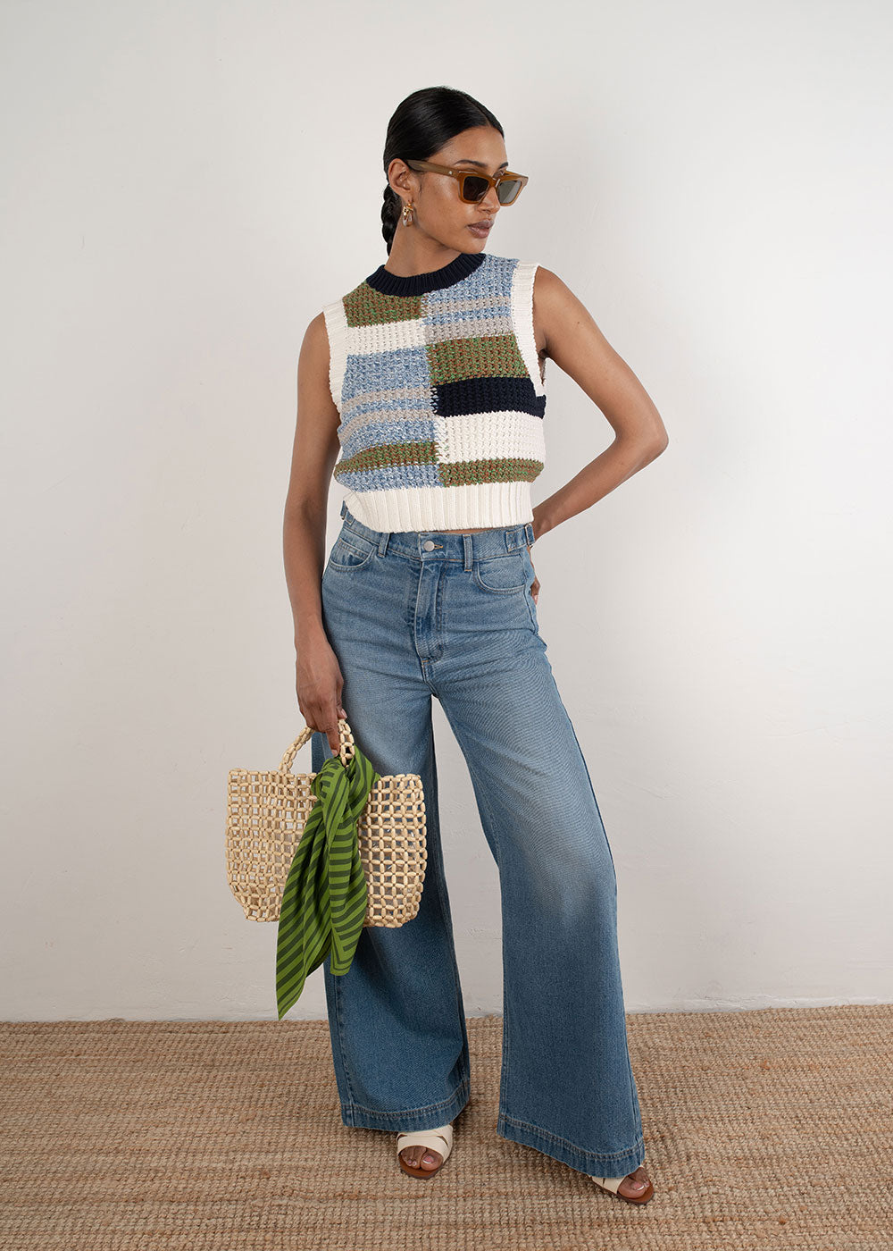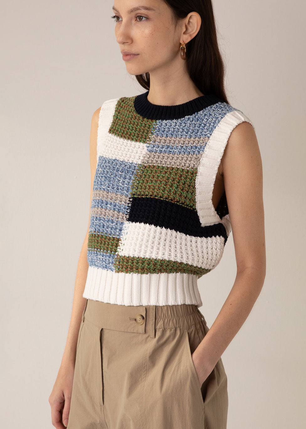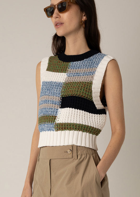 he Olivia Knit Tank is composed of 100% cotton, and features a colour-blocked design in cool neutral tones with ribbed trims at the neck and hem. The sleeveless silhouette and slightly-cropped cut make this an easy statement piece for layering or wearing alone in spring weather.