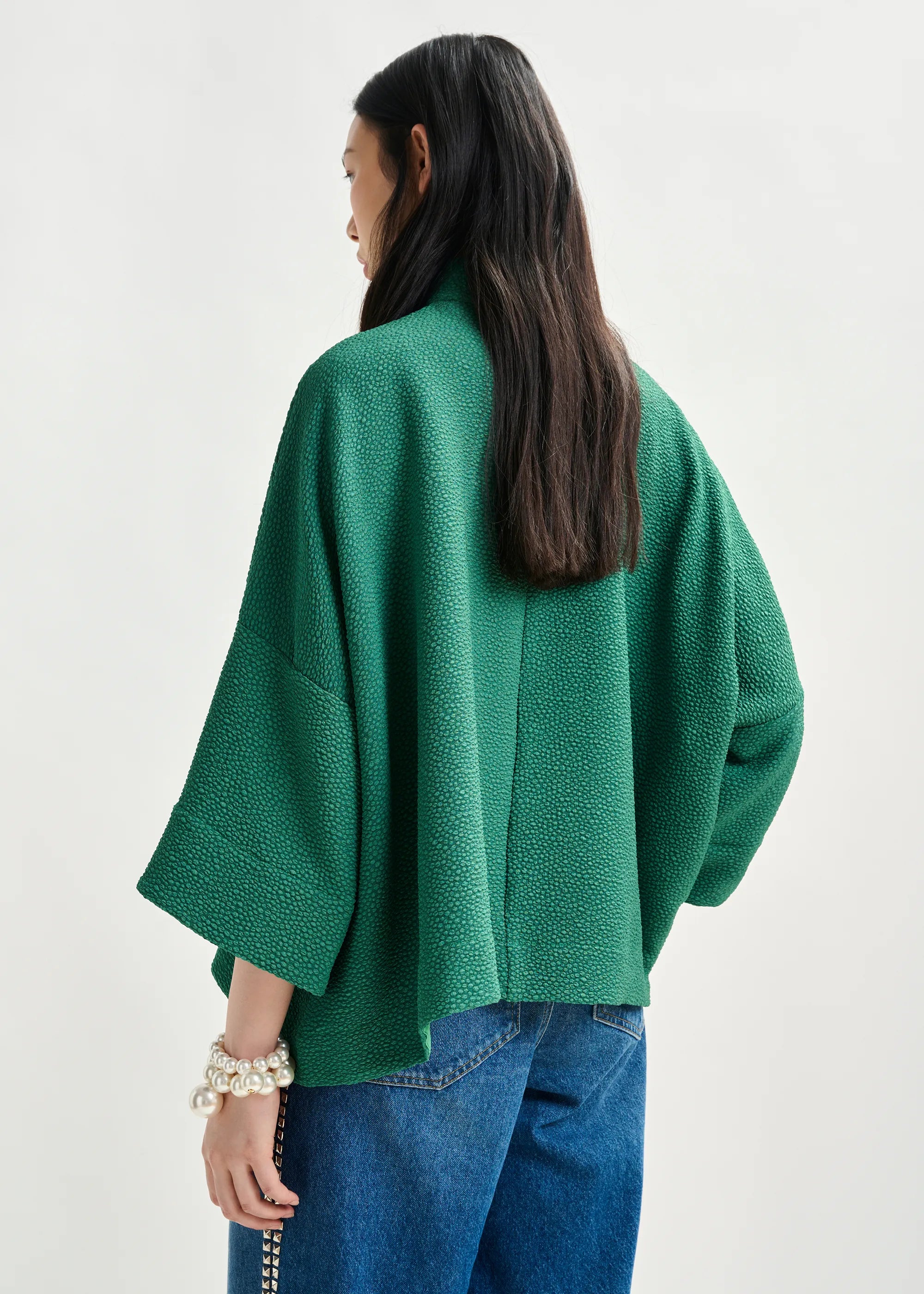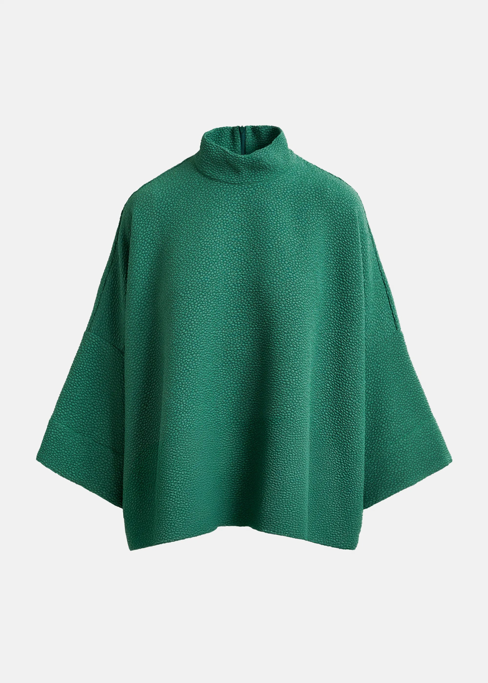 Kimono-like, oversized top is designed with a stand-up collar, hidden zip fastening at the back and wide 3/4 length sleeves. It is made from a recycled polyester-stretch blend fabric, woven with a subtly textured finish, blending comfort with style seamlessly.