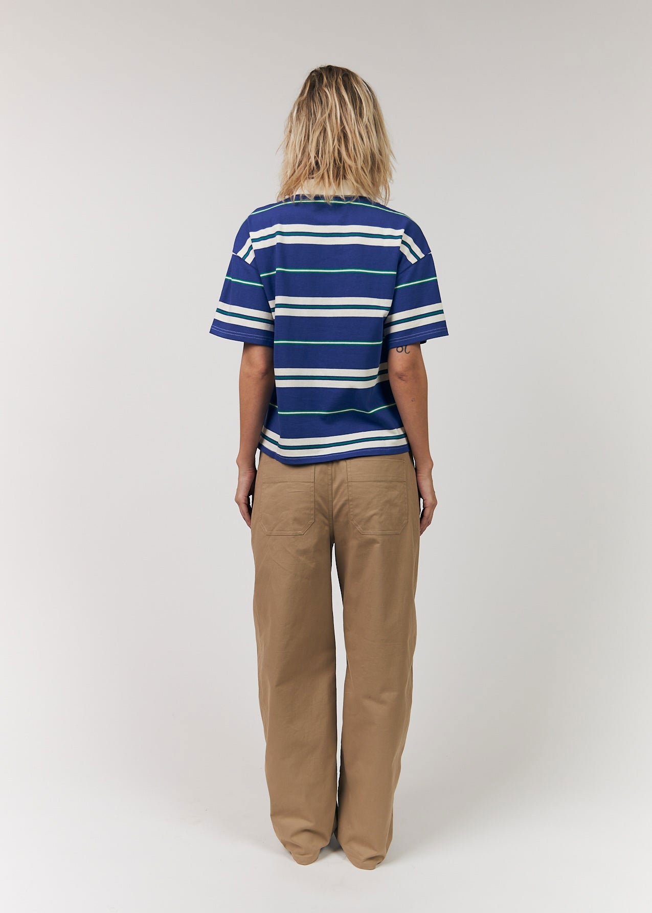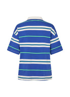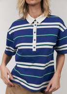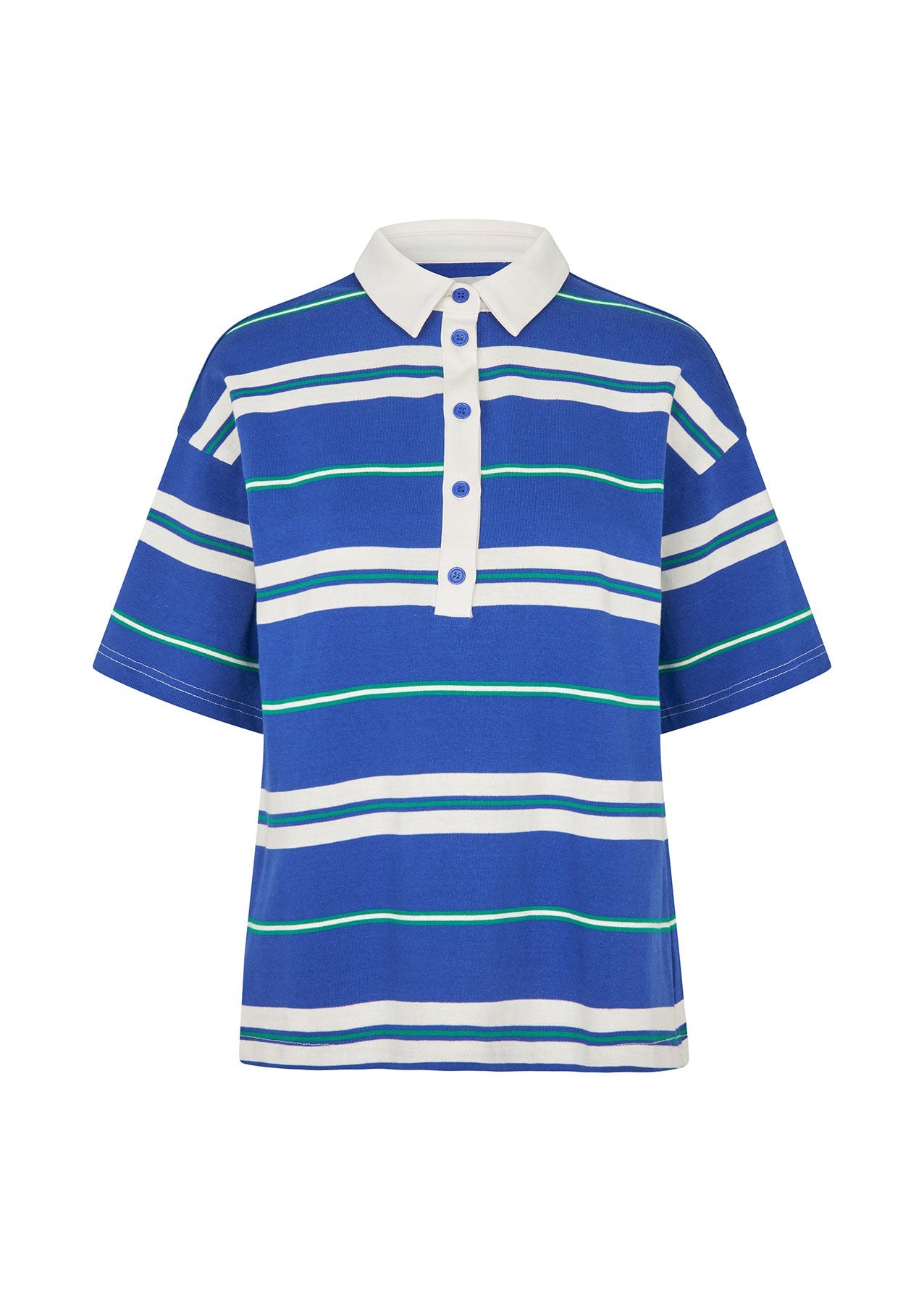 UlmaLL is a sporty and cool polo T-shirt with a classic twist. It’s designed in a soft cotton blend with wide stripes in blue, green, and white, while the white collar and button closure at the front add a preppy touch.