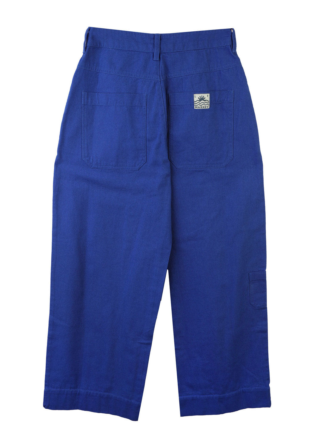 The Carpenter Trouser is a classic workwear staple, fitted at the waist with a straight cut leg. Made from a vibrant Cobalt cotton canvas. Features angular utility pocket detailing and a colourful sun and wave woven patch logo on the back pocket.