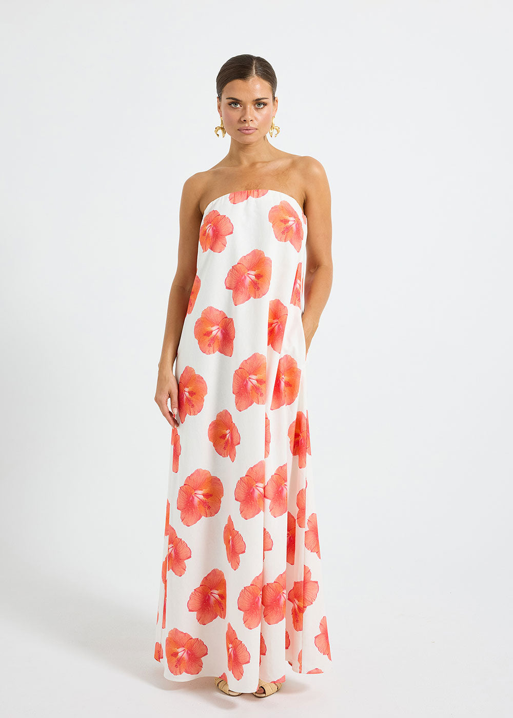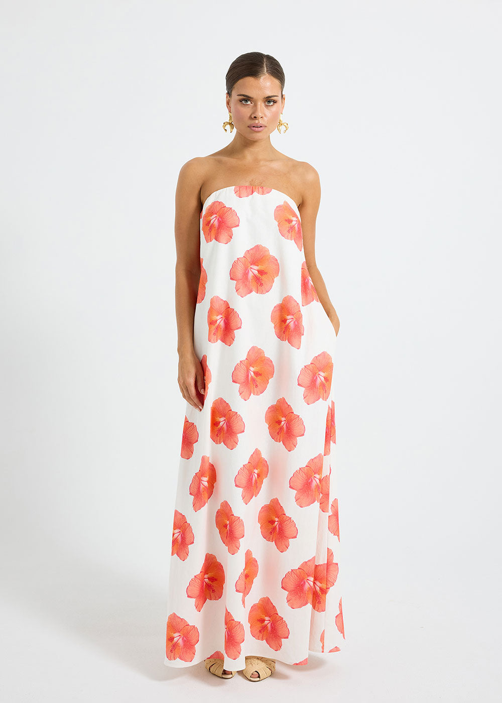 The Brielle Strapless Maxi by PASDUCHAS is crafted from a breathable linen–cotton blend, featuring an exclusive hibiscus print. Designed with a square-cut, strapless neckline, this trapeze silhouette falls softly over the body, complete with pockets and a flared, maxi-length hem. Fully lined for comfort, the piece is secured with an invisible zipper at the centre back for ease of fit and wear.