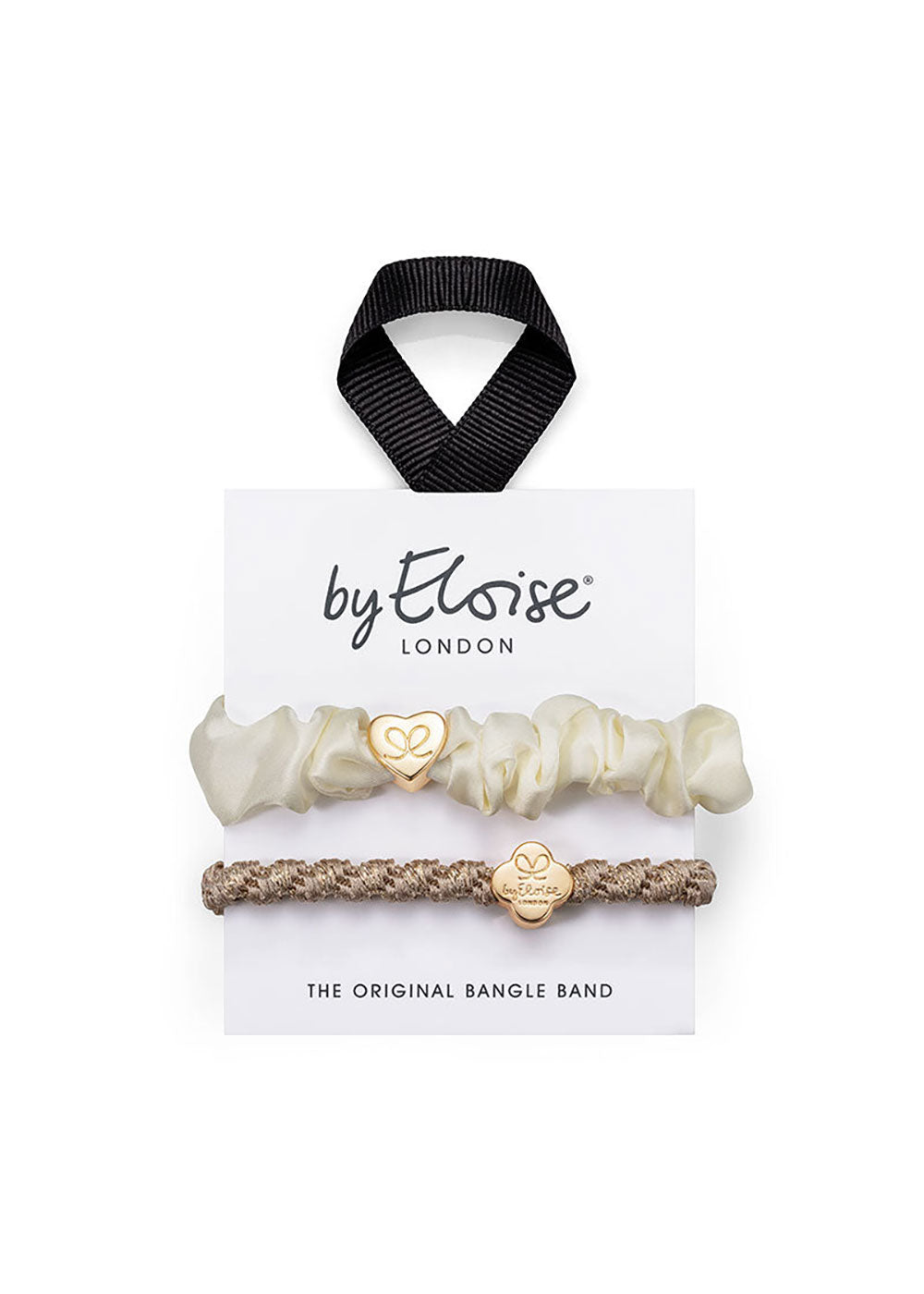 The set consists of Gold Heart Silk Scrunchie Cream and Woven Gold Quatrefoil Blonde.