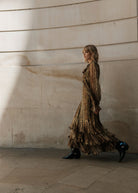 Farrah moves with untamed elegance, her cheetah print lurex chiffon catching the light in a slow, liquid shimmer. The cascading skirt sweeps the floor in rhythmic waves, while the languid self-tie neck drapes with effortless 70s glamour.